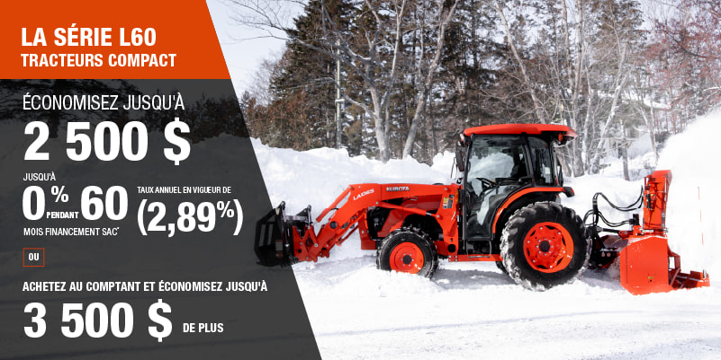 Le rabais présenté est offert avec un modèle L3560/L4060 est de 2 500,00 $. Le rabais s’applique avant les taxes et implique obligatoirement l’achat de l’unité motrice. L’offre ne s’applique pas aux transactions passées et n’a aucune valeur de rachat.