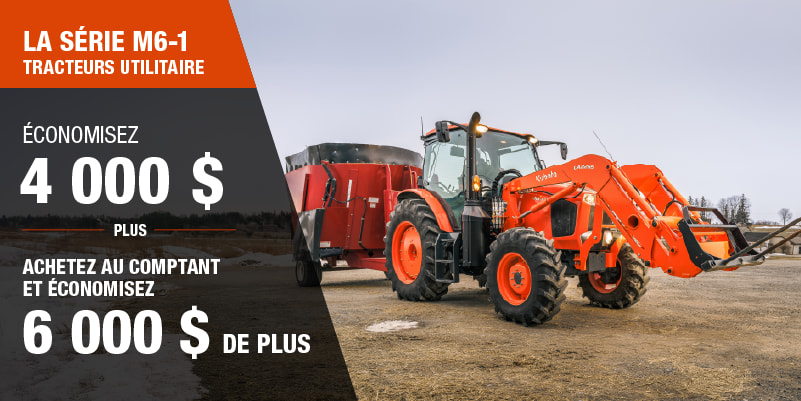 Les rabais présentés sont offerts à l'achat d'un modèle 128 neuf qui n'a jamais été immatriculé précédemment est de 10 000,00 $. L'offre ne s'applique pas aux transactions passées et n'a aucune valeur de rachat. La garantie de 4 ans ou de 4 000 h sur le groupe motopropulseur du modèle M8 et n'est valide que sur les produits distribués par Kubota Canada ltée. La ou les remises s'appliquent avant les taxes. L'offre ne s'applique pas aux transactions antérieures et n'a aucune valeur de rachat. L'offre est valide jusqu'au 12-01-2026